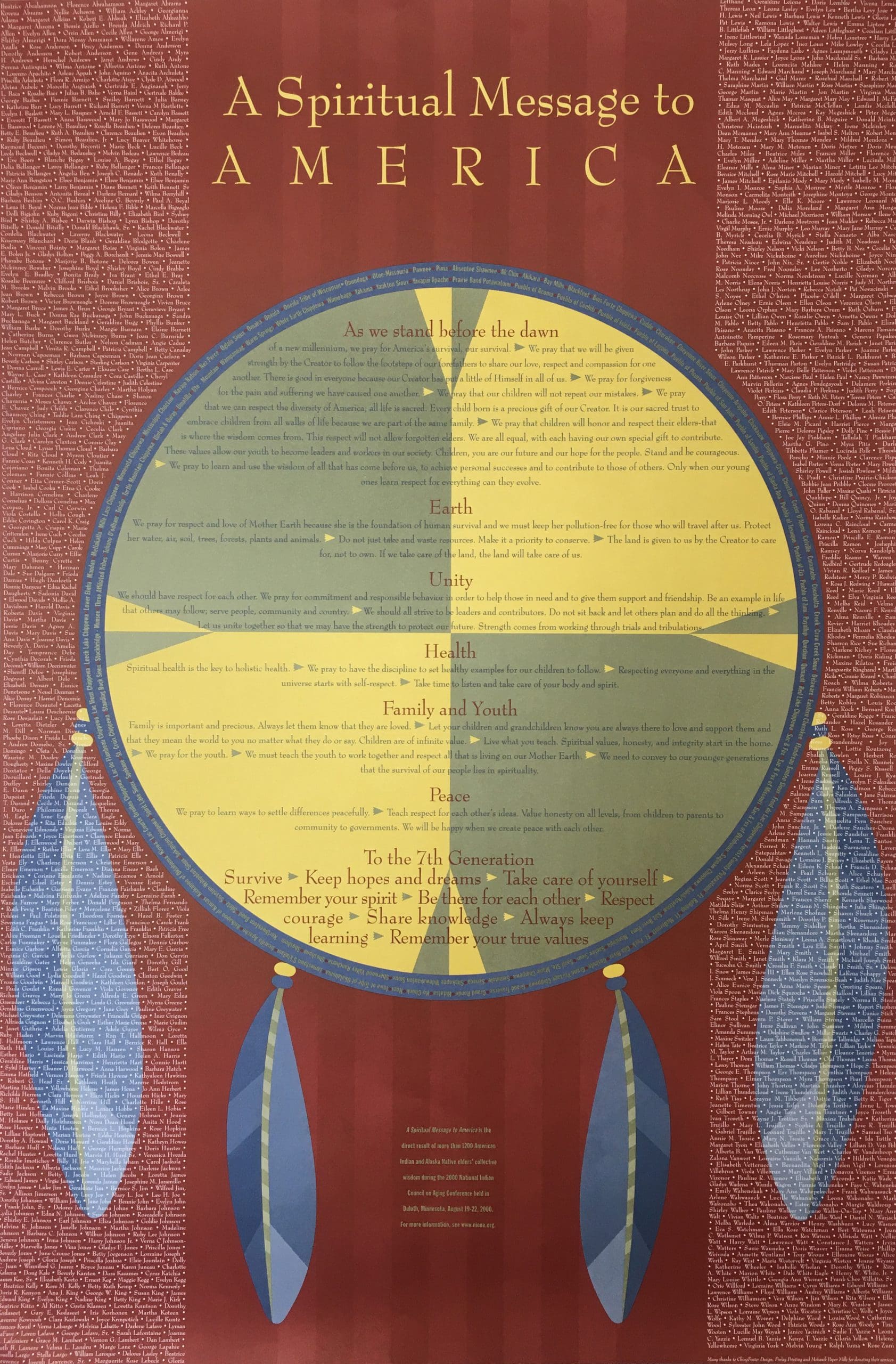 This message to America is the result of the National Indian Council on Aging 2000 conference in Duluth, Minnesota. More than 1,200 elders from 105 tribes across America attended and contributed to the words in this message. As you read this, think about our elders.