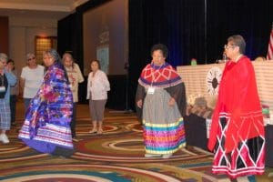 That evening, a cultural dinner featuring traditional foods of the Arizona tribes was held. The delicious dinner was a huge success. Pat Helton (Shoshone, Peiute, Karok), chairwoman of the Native American Senior Association, presented the Lord’s Prayer in Sign Language. There was traditional singing from the Tohono O’odham Nation and tribal social dances. Many in the crowd joined in. Afterwards, The Steppers, a group of Native women (all over 55) entertained with lively line dancing to contemporary tunes. The women, dressed in bright green shirts with black fringes, jeans, black cowboy hats and boots soon had the crowd on their feet, dancing right along with them.