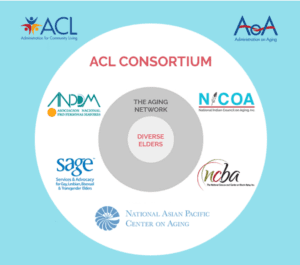 NICOA joins other aging organizations to provide an interconnected resource center. The consortium was established by the Administration for Community Living in 2012 and is composed of five national minority aging organization partners, each of whom represents a major racial and ethnic minority elder population: the National Association for Hispanic Elderly, the National Asian Pacific Center on Aging (NAPCA), the National Resource Center on LGBT Aging, the National Caucus and Center on Black Aging and NICOA. The consortium works as an interconnected resource center to decrease the prevalence of disparities among racial and ethnic minority and LGBTQ elders, their families and caregivers, by providing technical assistance to the Aging Network.