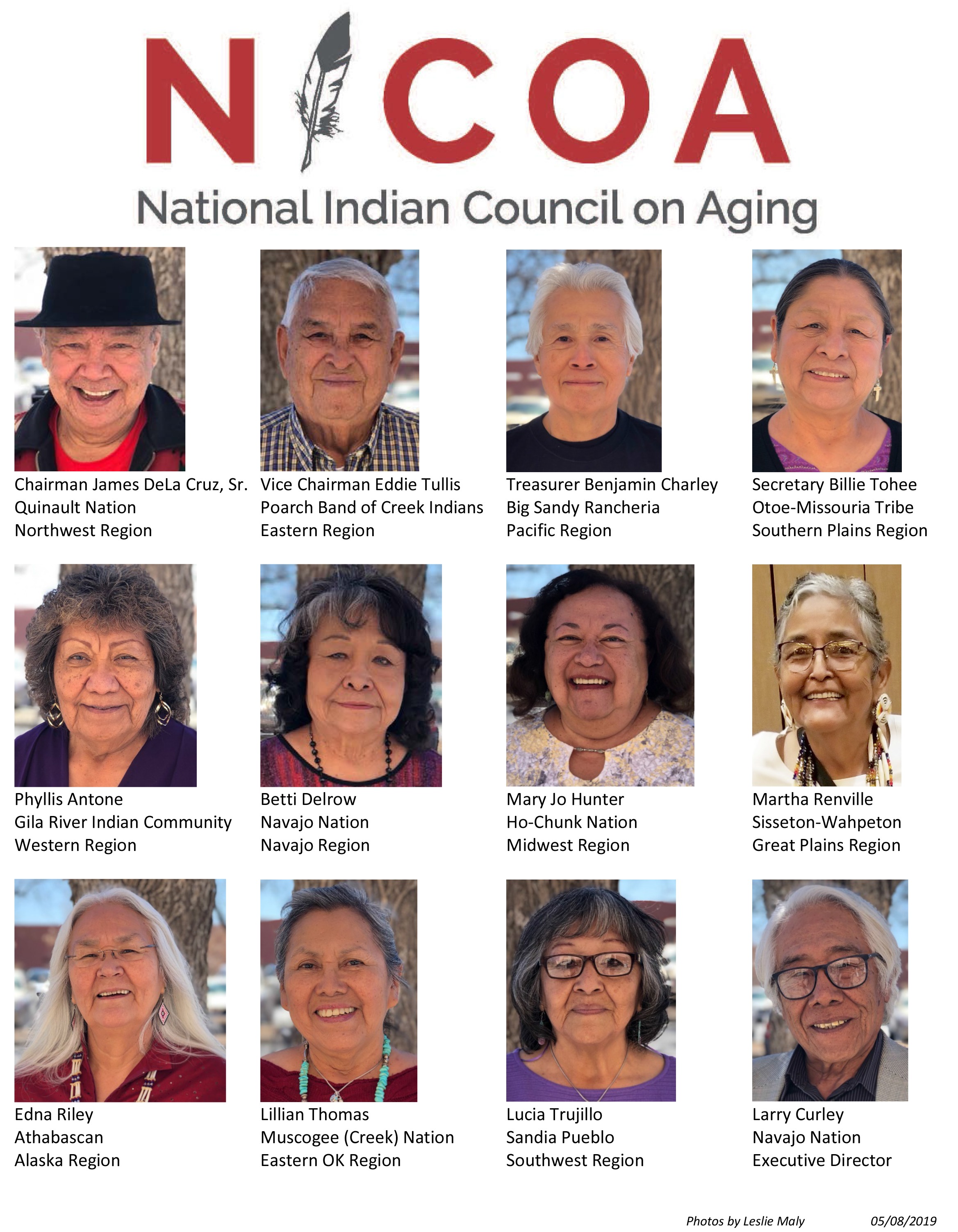 NICOA’s board of directors is comprised of enrolled members of American Indian and Alaska Native tribes who are 55 years of age or older. Board members represent each of NICOA’s 12 regions, with one additional member representing the National Association of Title VI Grantees, which follows that organization’s own elections process.