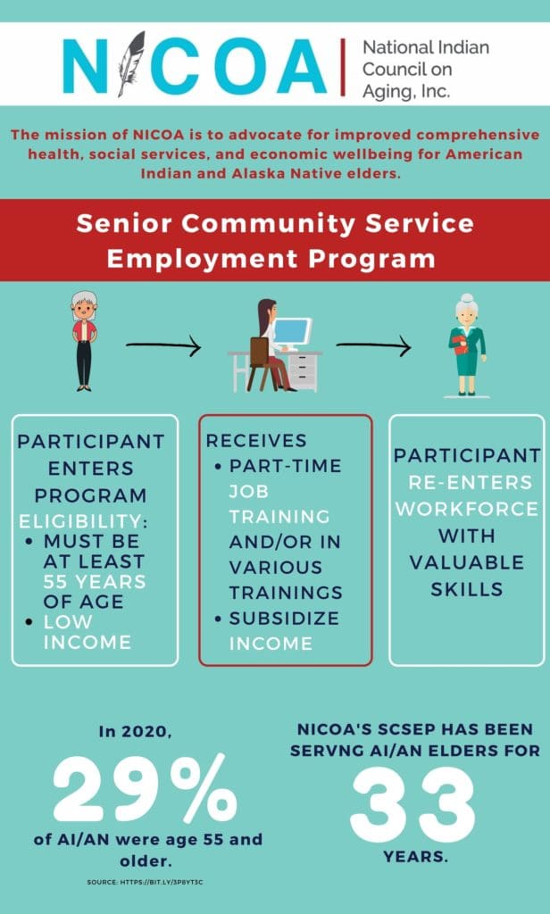 At the National Indian Council on Aging (NICOA), we help elders find work, develop new skills and talents, and build their financial security by taking advantage of the Senior Community Service Employment Program (SCSEP). SCSEP is an on-the-job training and employment program designed to help those age 55 and older update their jobs skills, build work experience and confidence, and continue to have economic security and well-being.