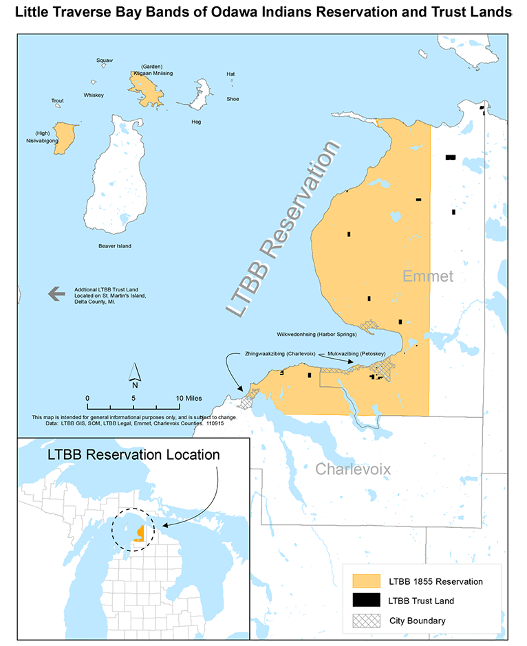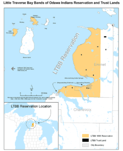 The Little Traverse Bay Bands of Odawa Indians has a case against the state of Michigan over whether the tribe has jurisdiction over 337 square miles of land in the northern part of the state. The land stretches along the shore of Lake Michigan and includes the city of Petoskey and part of Charlevoix. The tribe is not claiming they own the land, but that the land is a reservation and therefore they have the right to operate as a government entity to decide what happens there.